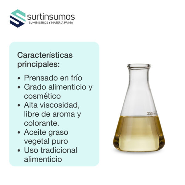 Aspecto: Líquido claro | Color: Amarillo pálido | Olor: Suave característico | Densidad: 0.91–0.93 g/ml | Solubilidad: Insoluble en agua, soluble en aceites | Estabilidad: 24 meses en envase original protegido de luz, a menos de 30°C.