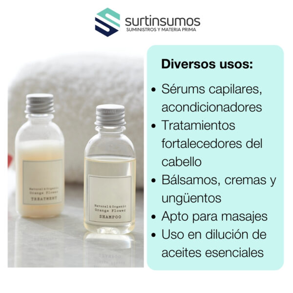 Emoliente profundo que suaviza y protege la piel. Lubricante natural ideal para productos capilares. Nutritivo y acondicionador para piel y cabello seco. Aporta brillo y nutrición al cabello. Compatible con aceites vegetales y bases cosméticas.