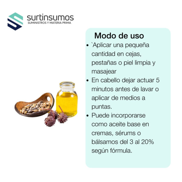 El Aceite de Ricino Puro Natural (INCI: Ricinus communis Seed Oil | CAS: 8001-79-4) es un aceite vegetal obtenido por presión en frío de las semillas de ricino. Se caracteriza por su alto contenido en ácido ricinoleico (hasta 90%), un ácido graso único con propiedades emolientes, lubricantes y nutritivas excepcionales.