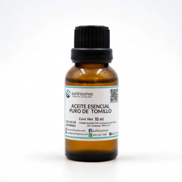 El Aceite Esencial de Tomillo Puro Natural (INCI: Thymus Vulgaris Oil | CAS: 8007-46-3) es obtenido por destilación al vapor de hojas y flores de tomillo. Rico en timol y carvacrol, posee una de las actividades antimicrobianas y antioxidantes más potentes entre los aceites esenciales.